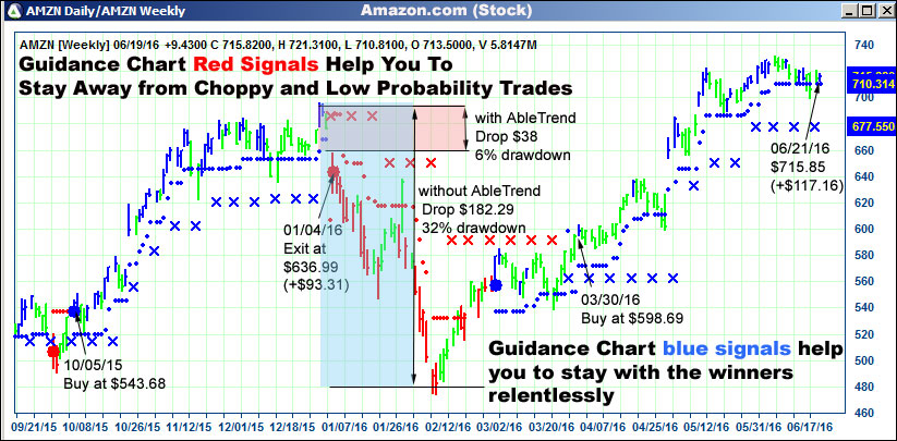 Always stay protected while pursuing big profits in the market is the key factor for a trader or investor to survive and thrive in the market. AbleTrend’s guidance chart can help you to do just that. Buy on blue and sell on red, AbleTrend’s no trade zones help you to stay away from the choppy and low probability trades; AbleTrend blue signals help you to stay with the winners relentlessly. Here are the two Amazon charts with AbleTrend Guidance Charts.